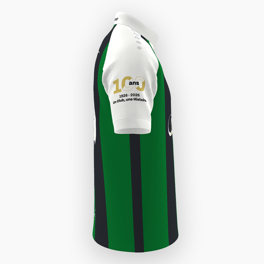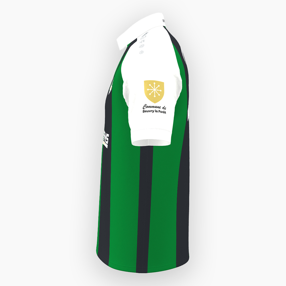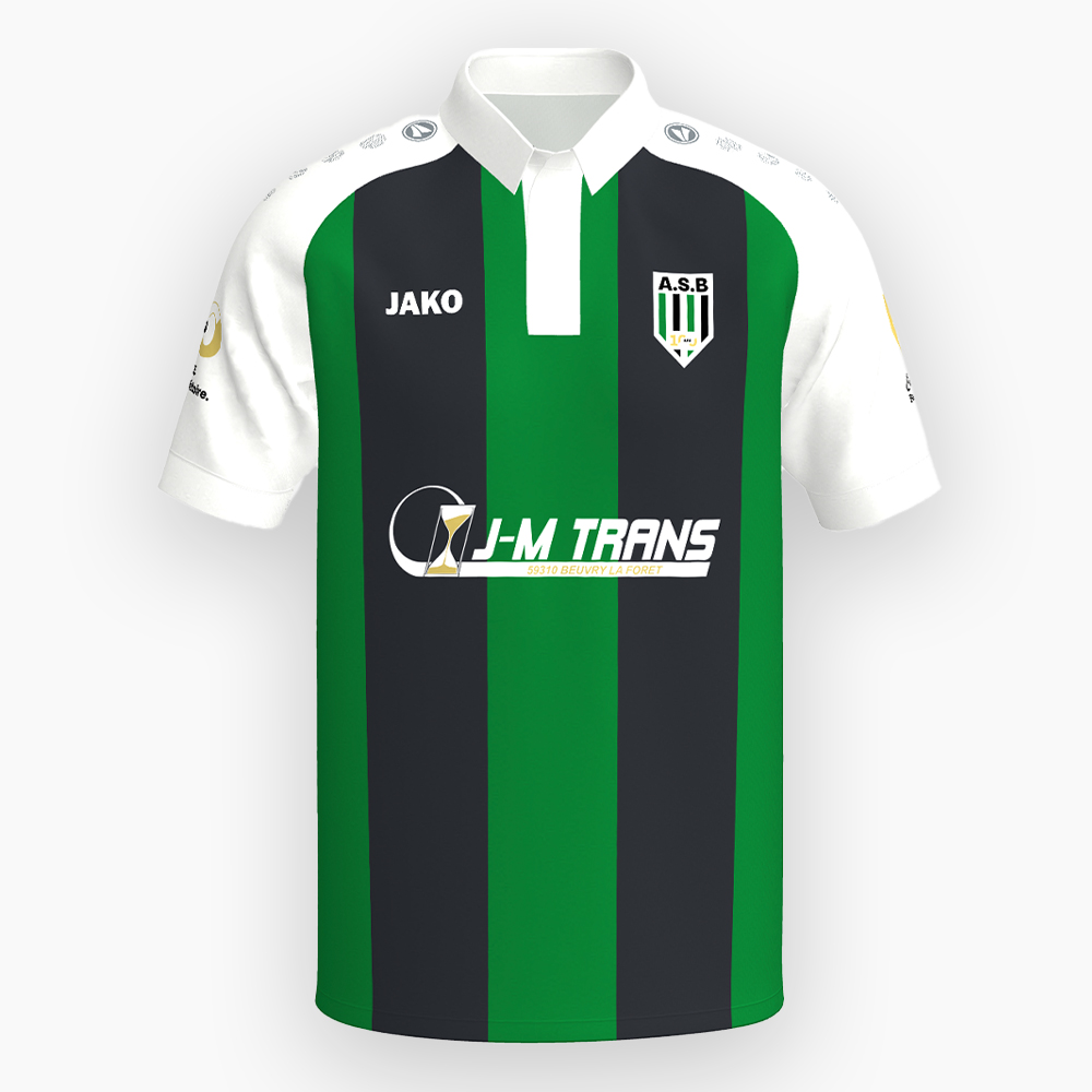 Ses bandes verticales vertes et noires, couleurs historiques de l’A.S.B., incarnent l’identité et la continuité d’un club profondément ancré dans sa commune. Le col rétro et les manches blanches rappellent les maillots d’autrefois, dans une interprétation élégante et intemporelle.